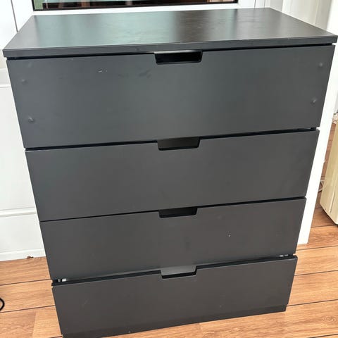 Hvit, romslig kommode. Ingen synlige skader. Men nederste skuff er litt sparken, se bilde. Må hentes på Fantoft.
