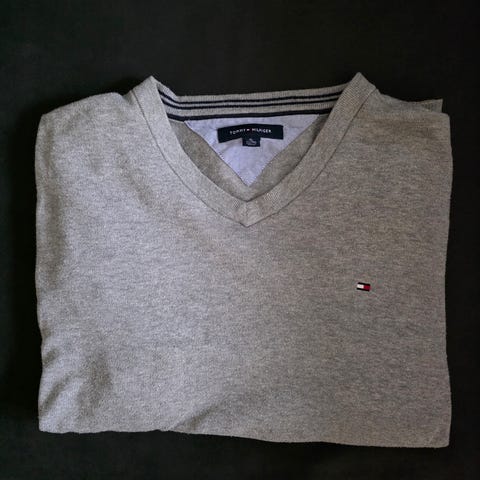 Tommy Hilfiger genser i størrelse XL, grå farge, laget av bomull. Genseren har V-hals og er designet for menn.