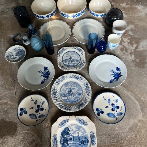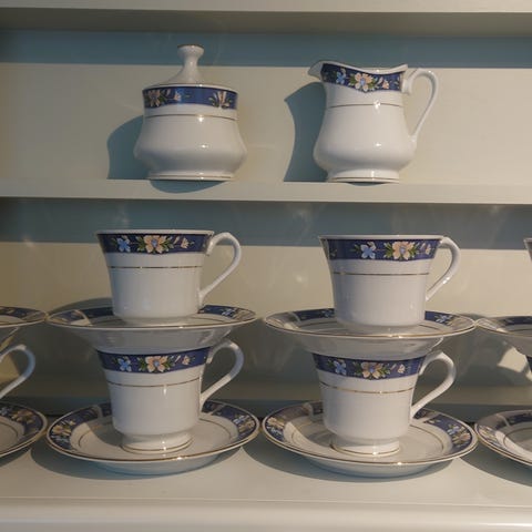 &Tradition servise som inkluderer kopper og tallerkener med blomsterdekor.