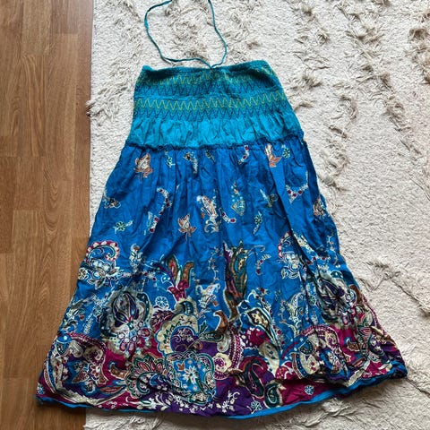 Kjempesøt sommer kjole i blomster materiale. Str. M/L. Merket er turquoise. Fikk i gave og har derfor desverre ikke kvittering. Men tror nypris ligger på omtrent 1500. Desverre heller aldri brukt, da den er for stor til meg. Samtidig, så er den stretchy ved brystet og bak. Blondedetaljer nederst på kjolen.