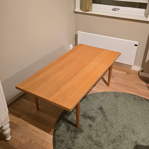Bolia Mood sofabord, Ø90 (høyde 43cm). Overflaten er av ask finér og i fargen Dust blue. Bordet er i god stand og lettstelt. Noen små bruksmerker rundt kanten. (Se bilde). Hentes.
