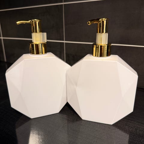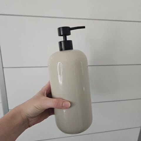 Hvit såpedispenser med pumpe i keramikk. Designet med vertikale riller på beholderen. Egnet for bruk med flytende såpe eller annen væske. Passer til kjøkken eller baderom.