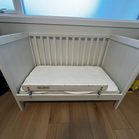 Den har noen merker, men fungerer helt fint. Madrassen kan følge med, men har noen merker.