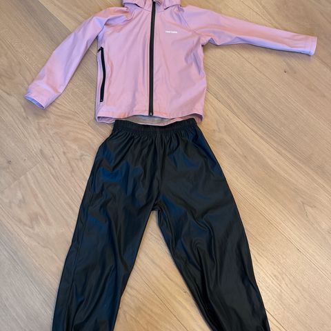 Foret regnsett i str. 110/116 fra Tretorn/ginatricot. Jakken har hette og elastiske mansjetter, mens buksene har seler og refleksdetaljer for økt synlighet. Har mulighet til strikk under føttene.