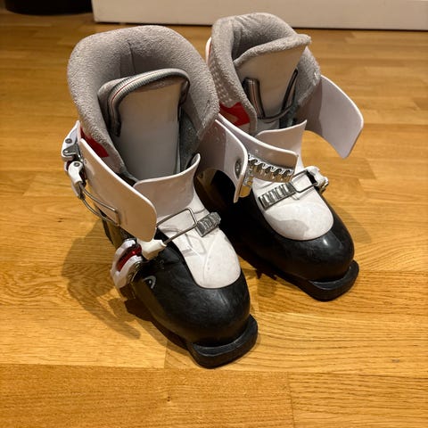 Head skistøvler med størrelse 23.0/23.5 Støvlene er svarte med grønn innside og har flere spenner for justering. Egnet for bruk i vintersport.