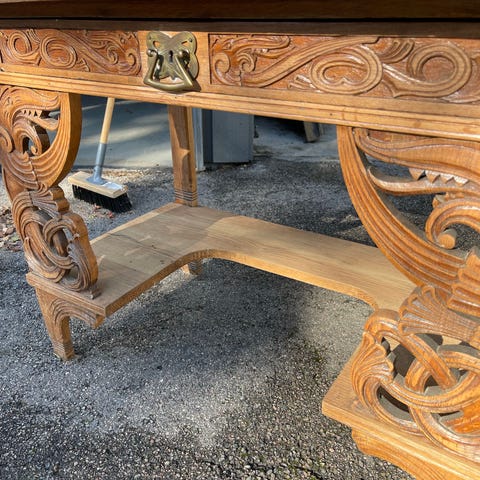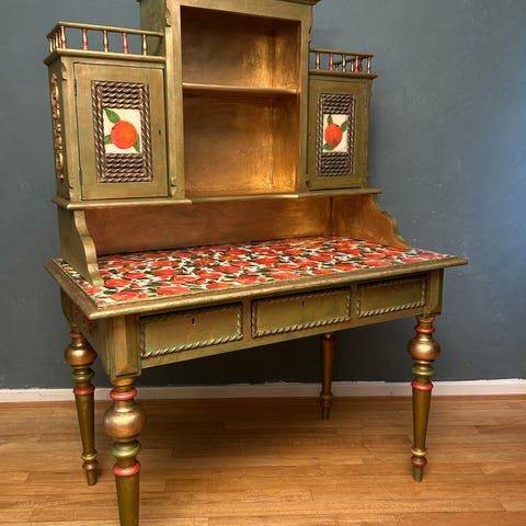 Spisestue i flammebjørk fra 1946. Spisestuen har 6 stk stoler og 4 stk ileggsplater. Med alle 4 platene inne, så blir bordet ca 4 meter langt. Det følger også med 3 stk skjenker i forskjellige størrelser. Her har du godt med plass til servise, sølvtøy, glass, vaser og annet du måtte ønske. Den ene stolen har en skade, men den påvirker ikke bruken. Målene på alle delene kan ses i det ene bildet. Må hentes i nærheten av Lillestrøm.