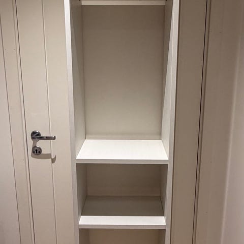 IKEA veggskap type BESTÅ i hvit farge. Består av tre sammenmonterte 60 skap. Hvert skap har en hylle og dør med trykk-åpner. Passer til montering på vegg.