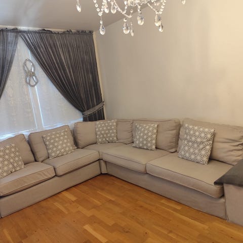Tre år gammel hjørnesofa selges, se mål på siste bilde. Putetrekkene behøver en vask, og en liten hund har hatt sitt hjørne i sofaen - en grundig støvsuging må derfor påregnes. Ingen hull eller skader. Nypris 12.500 kr.