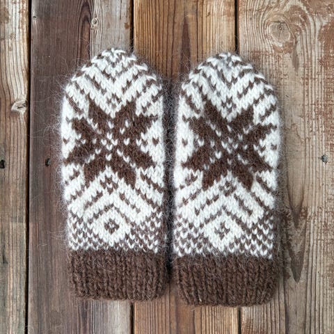 Helt nye tova selbuvotter strikket i det islandske garnet alafosslopi i gråbeige og hvit.