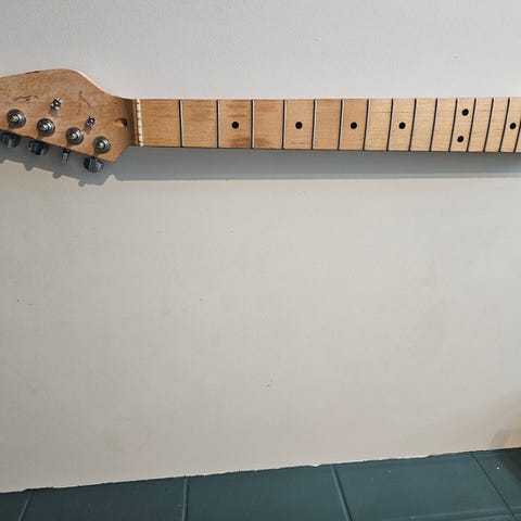 Hals m/tuners av ukjent opphav selges, passer strat type kropp. Har noen skarpe bånd og bør gåes over.En bøssing til tuners ble erstattet med en annen type som ikke passet skikkelig.