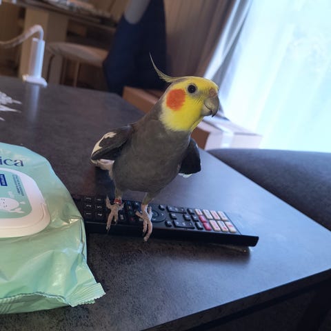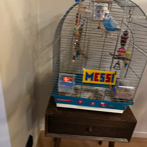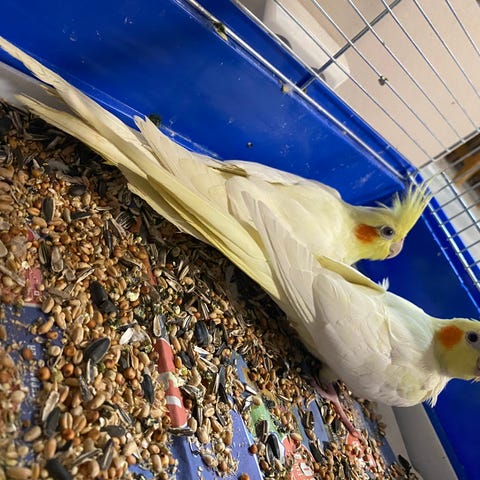 To nymfeparakitter selges med bur og utstyr. Vet ikke hvilke kjønn de er. De er ikke tamme, men kan bli.