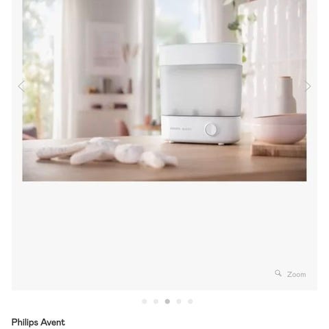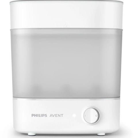 Philips Avent Dampsterilisator for desinfisering av babyflasker og tilbehør. Etter kraftig dampsterilisering blir flasker og tilbehør tørket av en konsentrert strøm av filtrert luft, slik at de umiddelbart blir klare til bruk.