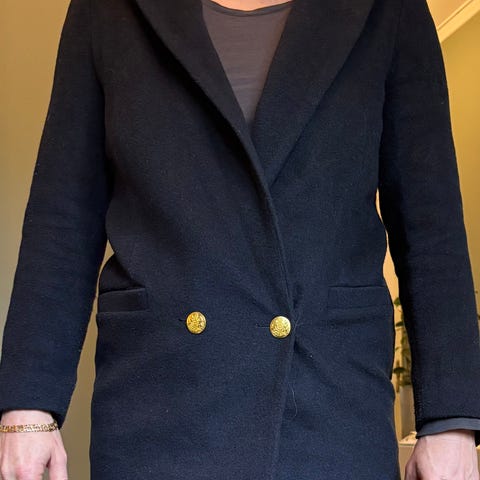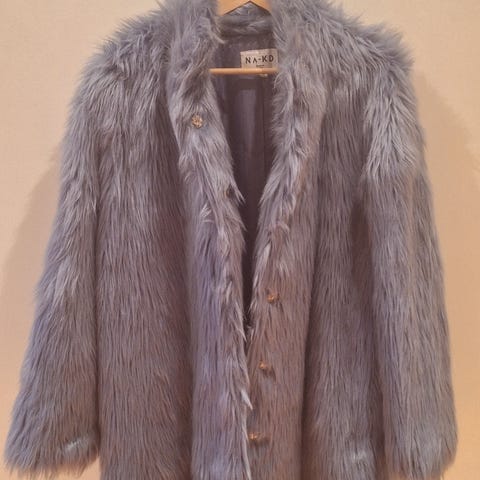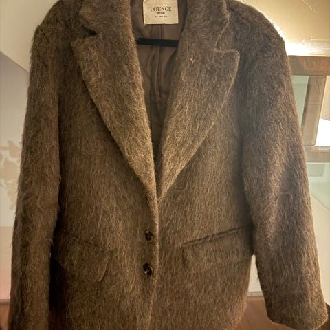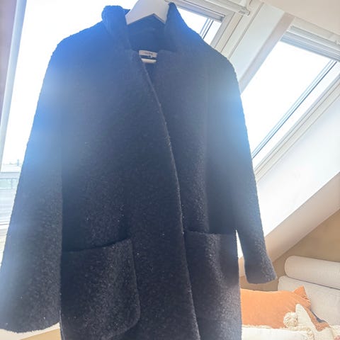 Mørkeblå Ganni ulljakke i modellen wide collar jacket fluffy wool. Størrelse 36. Brukt en gang, fremstår som ny. Ny pris 4400kr.