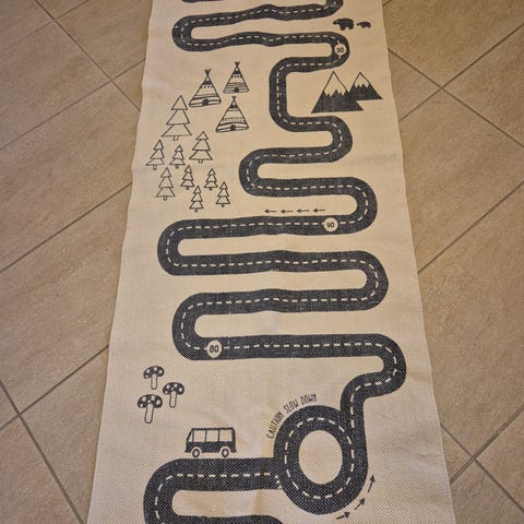 Oyoy Barneteppe med bilbane i svart-hvitt design. Teppe med mønster av bilvei, trær, busser og telt. Passer til barnerommet som leketeppe eller dekorasjon.