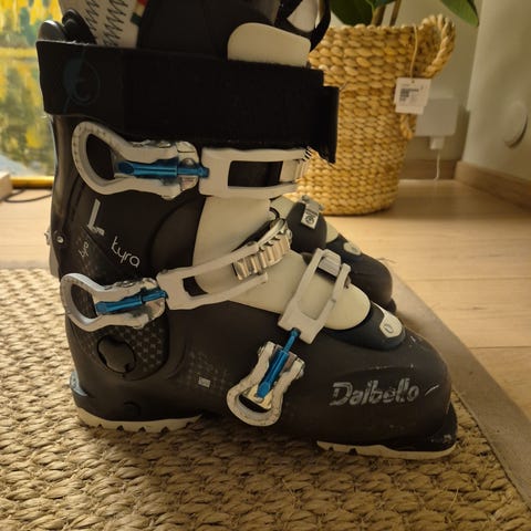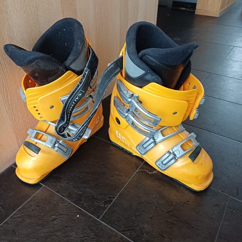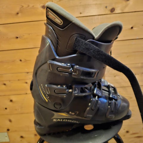 Salomon skistøvler i blå og svart farge med oransje innside. Utstyrt med spenner for justering og god passform.