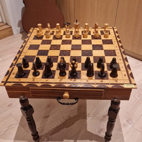 Sjakksett i dekorativ trekoffert ,kjøpt i Kina i slutten av 2000-tallet. (2008)