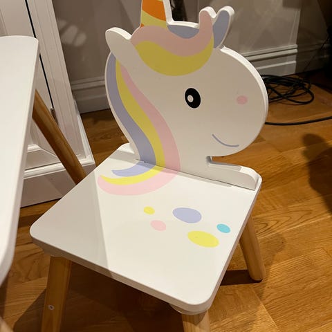 Barnebord fra Ikea, noen bruksmerker i bordplaten. Følger med 2 stoler fra ikea også. Den hvite har både bruksmerker og malingen er litt flasset av, se bilder. Den røde trenger seg nok mest en litt bedre skrubb enn det jeg har gjort. Møblene blir fine med litt enkelt vedlikehold. Selges derfor billig, må hentes i Kroken.