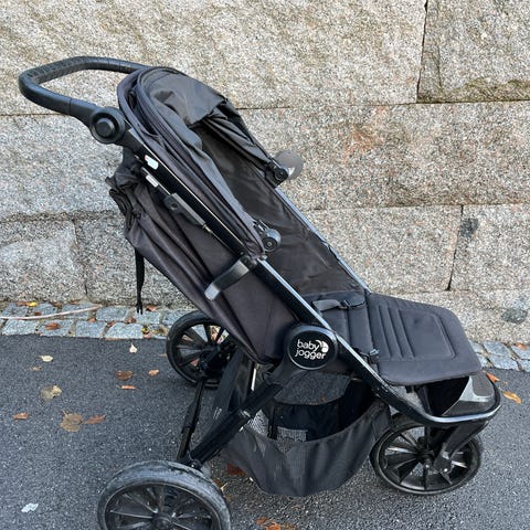 Pent brukt Baby Jogger City Elite 2 barnevogn med tre hjul og justerbar solskjerm.