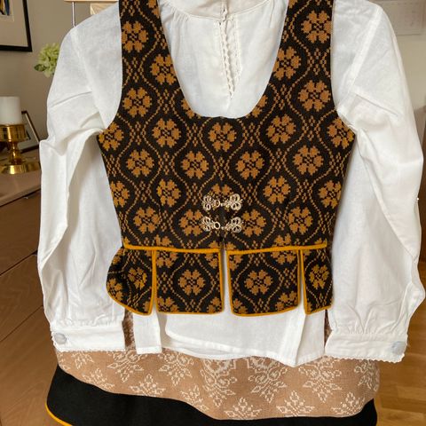 Tror stoffet i stakken er utgått fra Solberg. På Husfliden nettside er bunaden priset fra kr 6.195 uten skjorte.