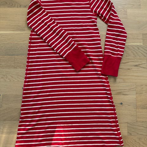 Veldig søt og supermyk kjole fra Mini Rodini, i str. 128, med røde og beige striper. Trykknapper bak.