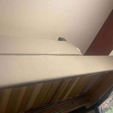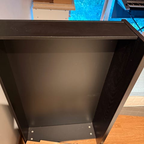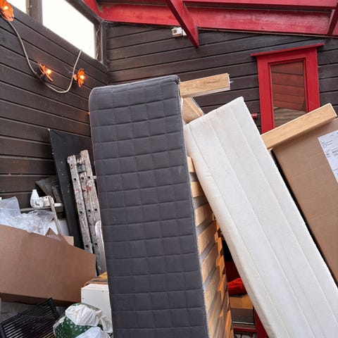 Det er egentlig en seng med elektrisk justering opp og ned, men den er ødelagt. Prøvde derfor å demontere motordelen, men da ble plankene løse 2/3 inn i lengden. En handy person må feste en kloss eller noe under plankene for at de skal sitte stabilt.
