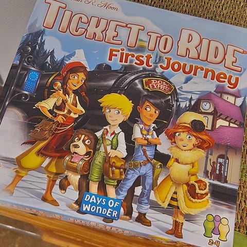 Days of Wonder Ticket to Ride brettspill med togtema. Spillet inkluderer ulike fargede spillbrikker, kort og spillkomponenter. Brettspillet er designet for flere spillere og har et klassisk tog- og reisetema.