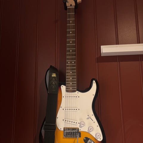 Hei den er laget av Esp gitar sjelden vare’!! det sitter seymour duncan pickups låter kjeme bra!! Alt funker topp:) det følger med gig bag:) kom med spørsmål bytte kan være interessant 😀