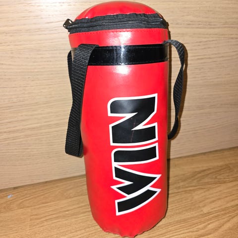 WIN Bokseutstyr bestående av en rød boksebag og matchende boksehansker. Utstyret er designet for trening og kampsportaktiviteter for barn. Boksebagen er ca 45cm høy. Nesten ikke brukt. 150kr.