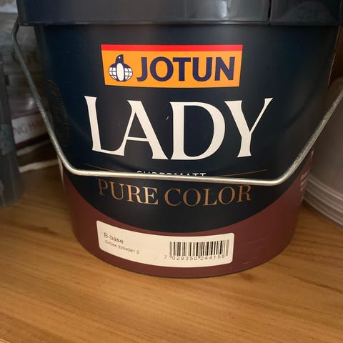 Vi kjøpte alt for mye maling. Har brukt litt av det ene spannet, og det andre er uåpnet. Fargen ser du ferdig på veggen på det ene bildet tatt under maleprosessen.