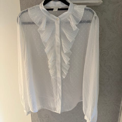 H&M bluse i gråsvart silke, størrelse 42 for kvinner. Blusen har en glatt tekstur og langermet design. Egnet for formelle og uformelle anledninger. Splitt i siden. Brett / Søm fra hals og ned yttersiden av ermet, se bilde. Knapp i halsen bak. Ikke brukt, som ny.
