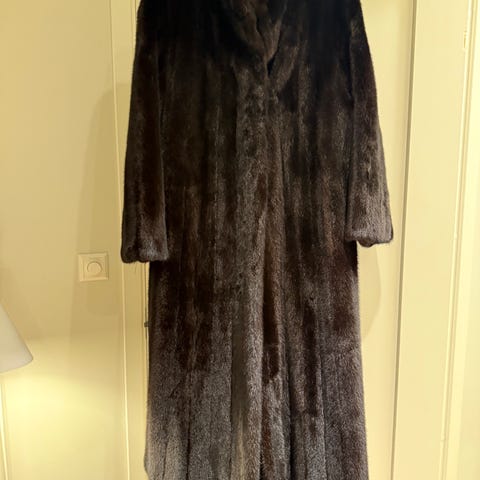 Elegant lang pelskåpe i Saga Mink fra den anerkjente norske produsenten Madsen Pels, kjøpt hos Iversen Pels AS i Drammen. Klassisk og tidløs modell i svart mink i hele skinn, av svært høy kvalitet og silkefôr.