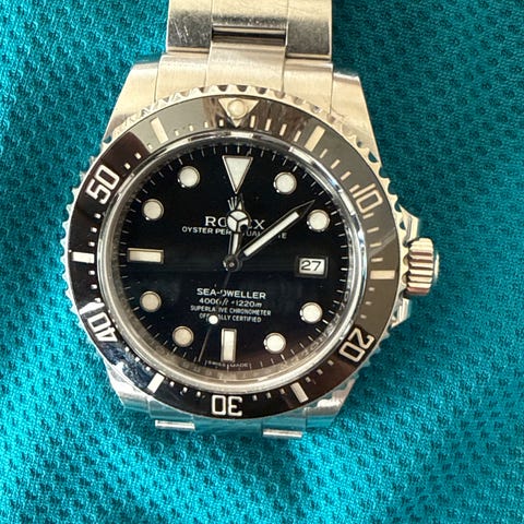Rolex Submariner herreklokke med svart urskive og stållenke. Klokken har roterende bezel og er designet for vannmotstand. Materialet er rustfritt stål, og klokken er beregnet for herrebruk.. klokken er fra 2022. Meget fin stand, noen hairlines på låsen. Det følger med alle ledd, og både grønn og hvit tag. Boks har jeg dessverre ikke. Refnummer er 124060 og bezel er keramisk