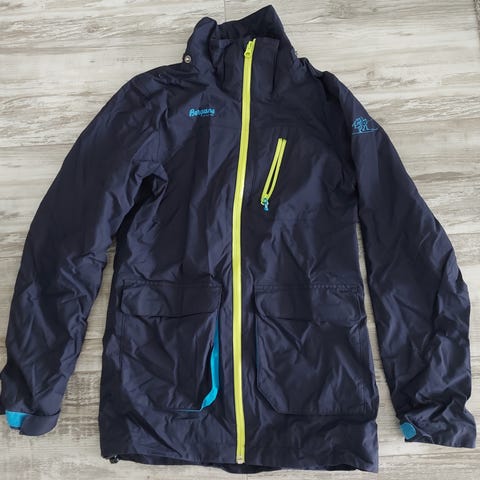 Jakken er i god stand, med unntak av glidelåsen som er ødelagt ved bunnen. Man må derfor "tre" inn i jakken. Er foret med dun og fjær.