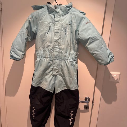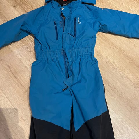 Isbjörn of Sweden vinterdress i størrelse 128, farge grå/brun. Passer for både gutter og jenter. Produktet har funksjonelle detaljer som elastiske mansjetter og er designet for å være slitesterkt og komfortabelt for barn. Mangler strikk i bena og en knapp til strikk. Dette kan enkelt settes på. Noe slitasje på knær, men ikke hull eller rifter i stoffet. Liten rift øverst ved glidelås i halsen, se bilde. Hempe til oppheng er røket. En navnelapp på kneet, denne går av ved litt mer innsats. Brukt av er barn (gutt).