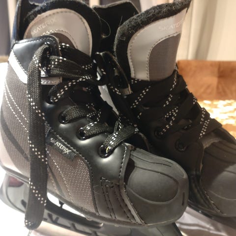 Fine skøyter for ishockey i størrelse 33. Skøytene har svart og hvit farge og er designet for barn som spiller ishockey.