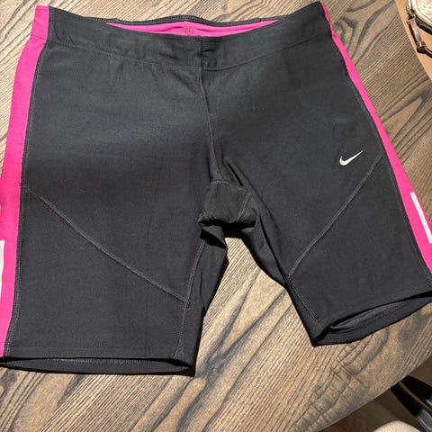 Nike løpeshorts for dame i størrelse M. Shortsen har Dri-FIT-teknologi som bidrar til fukttransport og økt komfort under trening. Fargekombinasjonen er rosa og svart, med elastisk midje og innvendig innerbukse for bedre støtte ved løping.