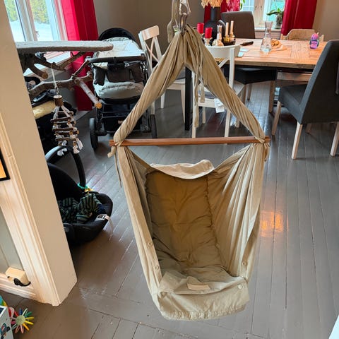 Pent brukt Moonboon med stativ, motor, oval kurv og sengehimmel. Ingen skader eller skavanker.
