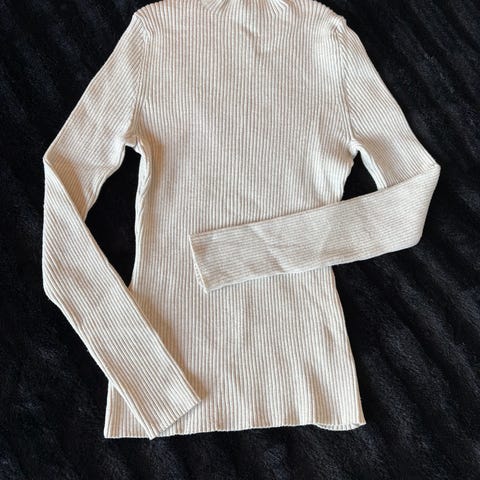 Tettesittende ribbestikket genser med en liten hals. Deilig myk svart genser i 55% polyester, 23% viskose, 22% polyamide. Pent brukt med normale bruksmerker.