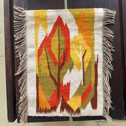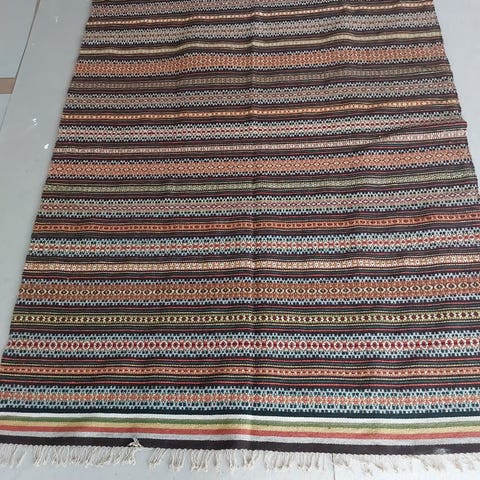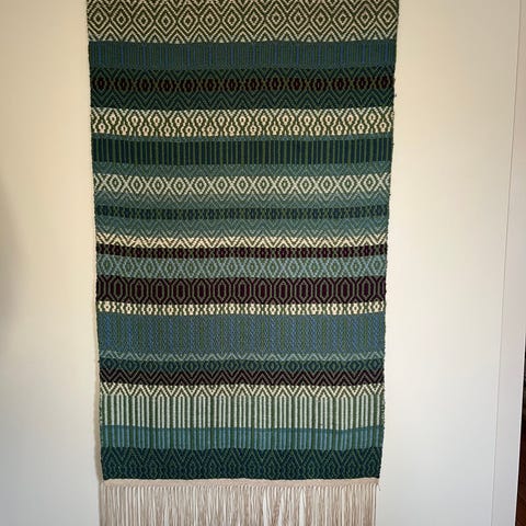 Håndlaget tekstilkunst bestående av fem deler med ulike mønstre i grå og svart farge. Teppet har frynser i endene og er vevd i ullmateriale. Passer til dekorasjon på vegg eller som duk