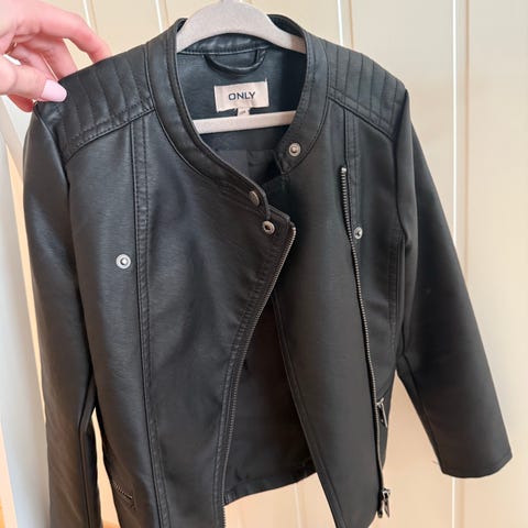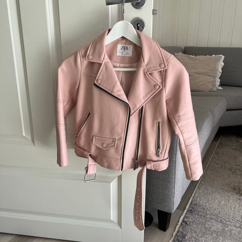 Rosa skinnjakke, strl 128. Selges rimelig, det er ikke ekte skinn. Brukt få ganger