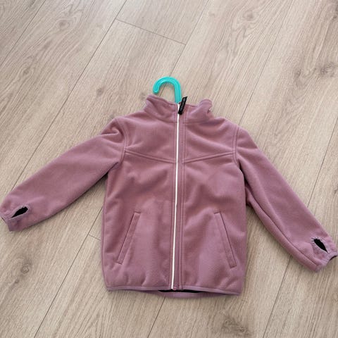Vindfleece fra Gullkorn design i str 98. Ingen hull. Perfekt å ha fra vår til høst. Flekk nede ved glidelåsen. Ikke forsøkt fjernet. Se bilde.