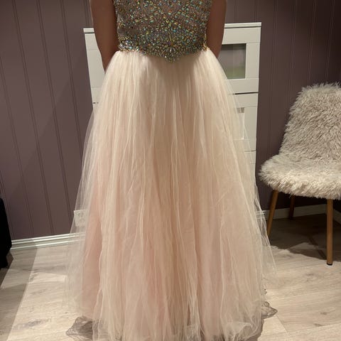 Ballkjole brukt en kveld. Str. L til XXL. Passer høyde fra 1.70 til 1.80, spørs høyde på sko. Kan klippes av.