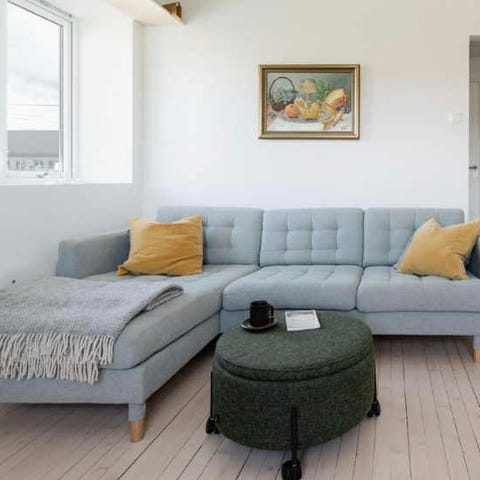 Fin IKEA landskrona selges i fargen gunnared blå/tre. Koster 6000kr ny hos IKEA. Du kan nå få den mye billigere, forutsatt at du kan hente den og bære den ut selv. Sofa står i 1. etg, men må bæres opp en liten skråning hvor bilen din kan stå parkert. Den er god å sitte i, men veldig dyp så man kan med fordel ha en del pynteputer i den.