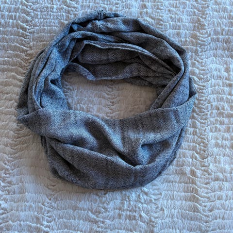 Mykt og godt skjerf som er godt brukt, men mye bruk igjen. Lappen er klippet av så jeg vet ikke hvilket materiale det er.