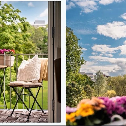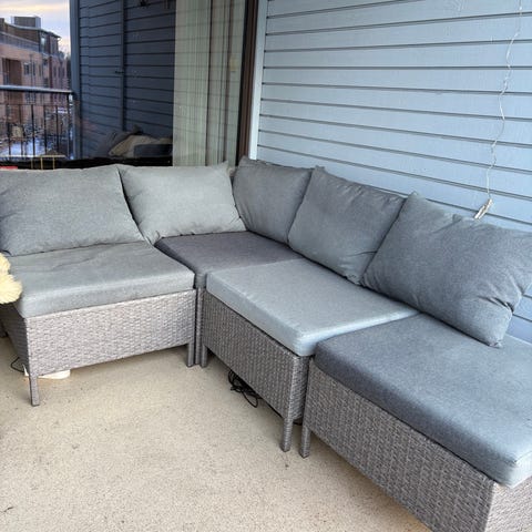 Utemøbler bestående av en benk (138x80x75) med puter og et bord (113x66x42). Møblene har en del slitasje, se bilder. De har vært brukt på innglasset balkong.