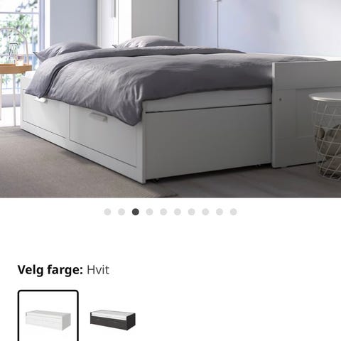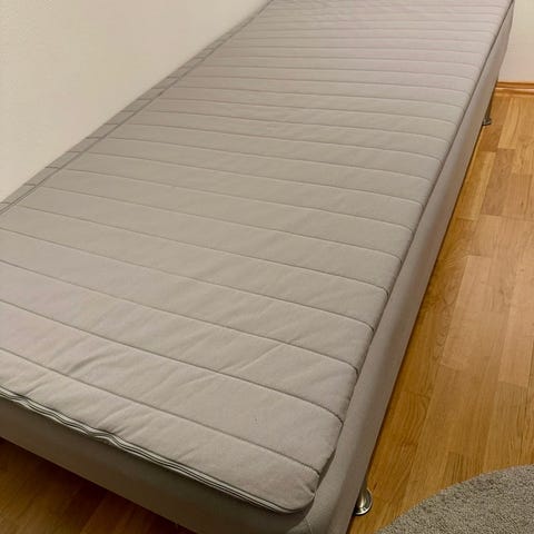 IKEA seng med metallramme og hvit madrass. Sengen har en svart metallramme med dekorative detaljer og en hvit madrass. Egnet for enkeltsenger og kan brukes i ulike rom som soverom eller gjesterom.