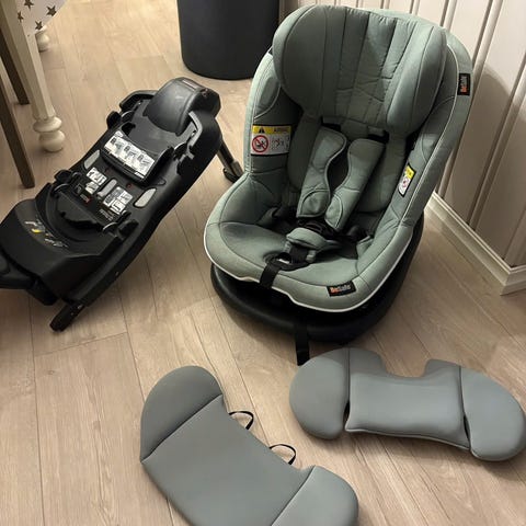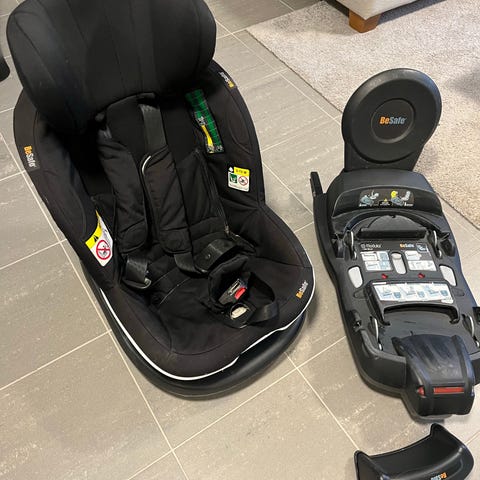 BeSafe Modular barnesete med base selges nå som barnebarna har vokst ut av det. Basen festes med iso-fix og setet klikkes på plass enten bakover -eller forovervendt.