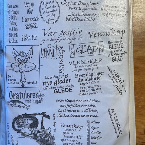 Stempelsett med ulike norske tekster og dekorative mønstre. Settet inneholder flere stempler med ord og uttrykk som kan brukes til kortlaging, dekorasjon og andre kreative prosjekter.