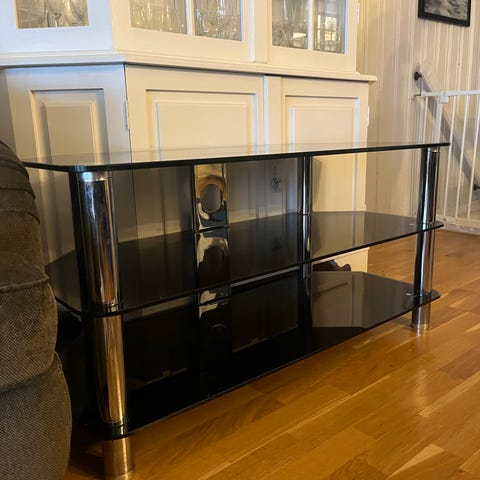 Moderne, romslig og praktisk tv-benk med to hyller og tre skuffer til oppbevaring. Hel og pen. Enkelt å skjule ledninger. Tv-benken har ingen bruksmerker med unntak av et bittelite hakk i lakken nederst på venstre side (se bilde). Må hentes i Asker.