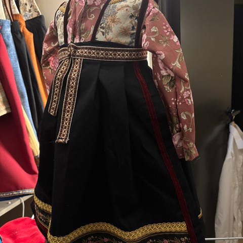 Skjorten er sydd av bomullsstoff med trykknapper i fine detaljer. Skjørtet og vesten er sydd av velurstoff med pynteband. Vesken kan hektes av.